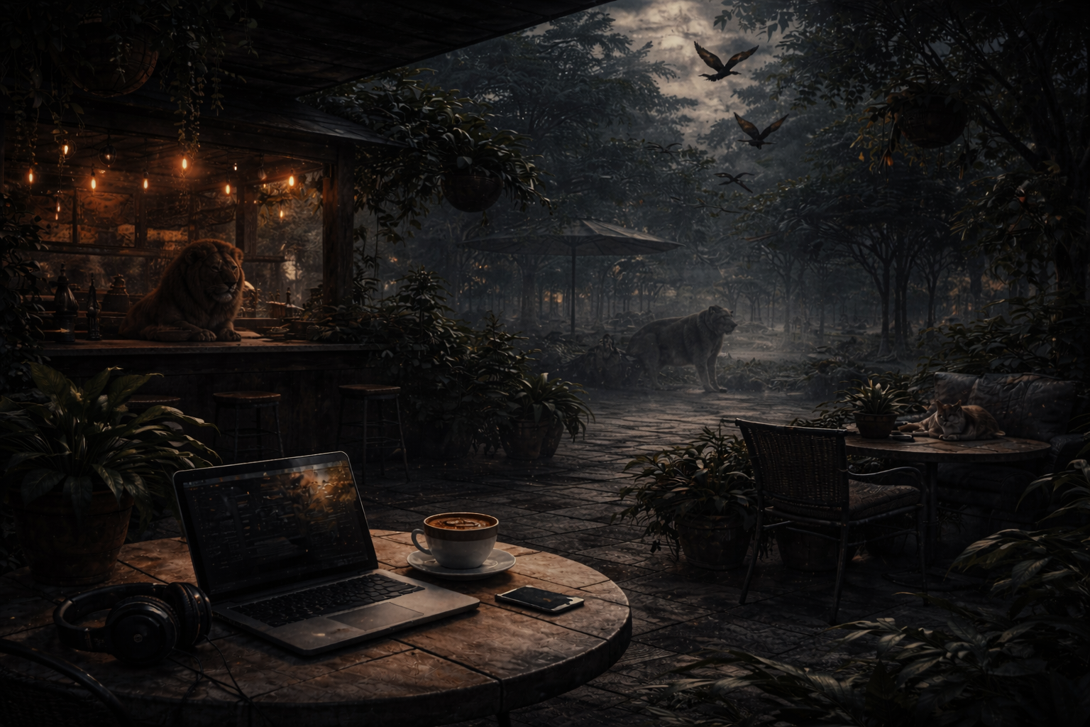 A cat strolls in, not daring to be seen by the lions and sits lazily in the corner. It doesn’t watch the others, lost in their own world. It shifts, corner to corner until it finds the spot it will keep long after the rest leave.